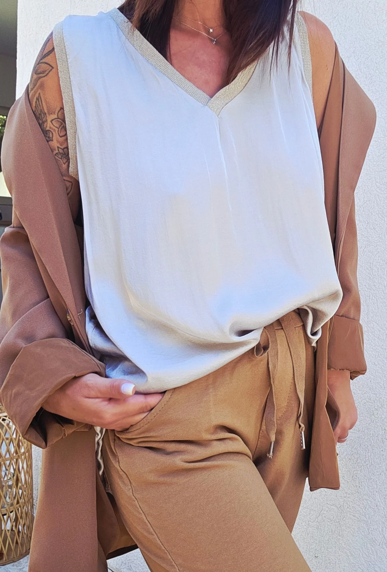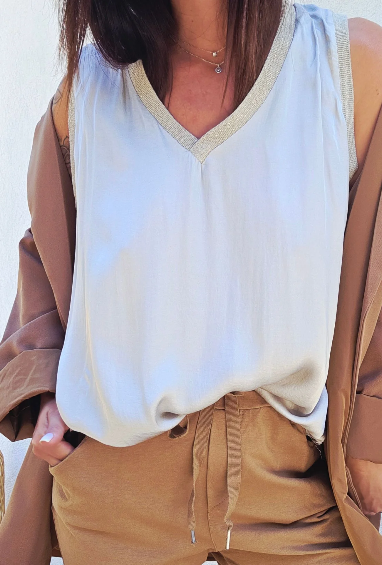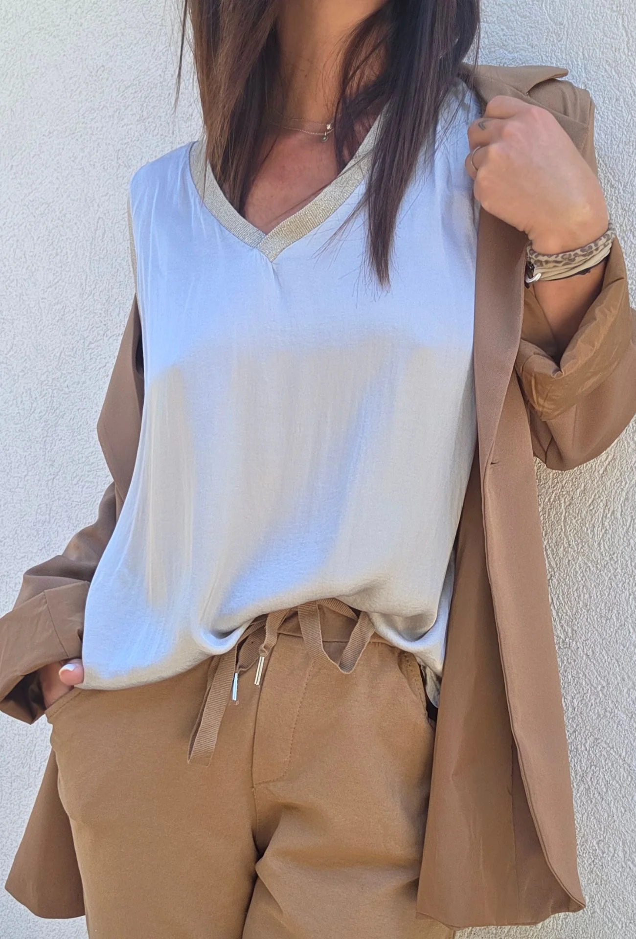 Laissez-vous séduire par la simplicité élégante du top LOUISE en beige. Avec sa coupe fluide, son col en V délicatement orné de finitions scintillantes, il est l’allié parfait pour des looks à la fois sobres et sophistiqués. Un intemporel de votre garde-robe, qui se marie avec tout.