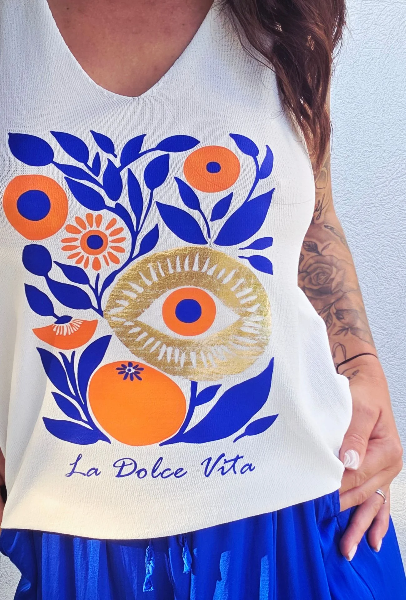 Plongez dans un univers pop et mystique avec le top FUN EYES, une pièce pleine de charme et de symbolisme. Sur fond blanc lumineux, un œil doré hypnotique s’entoure de motifs floraux bleu cobalt et orange vif, créant un équilibre parfait entre esprit bohème et énergie contemporaine. Son col en V et sa coupe droite légère en font un top ultra agréable à porter, idéal pour la saison estivale.