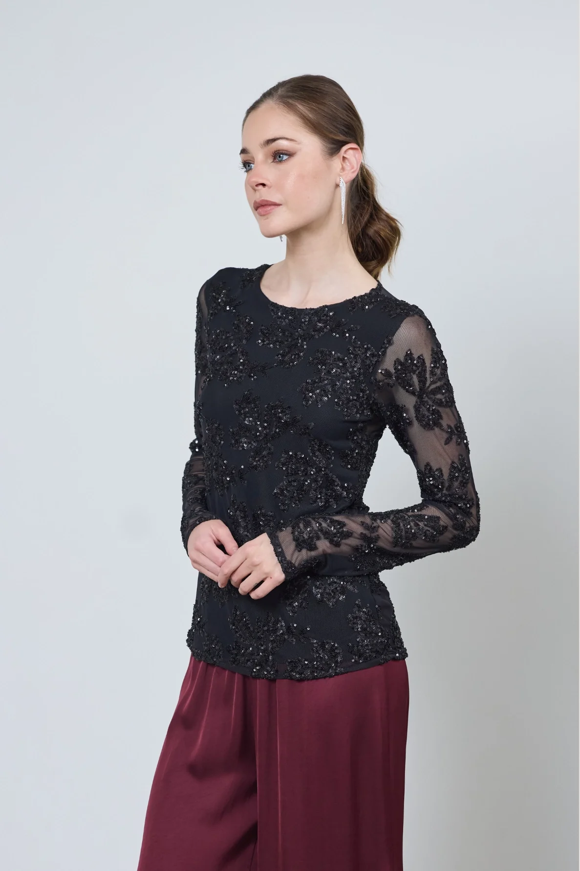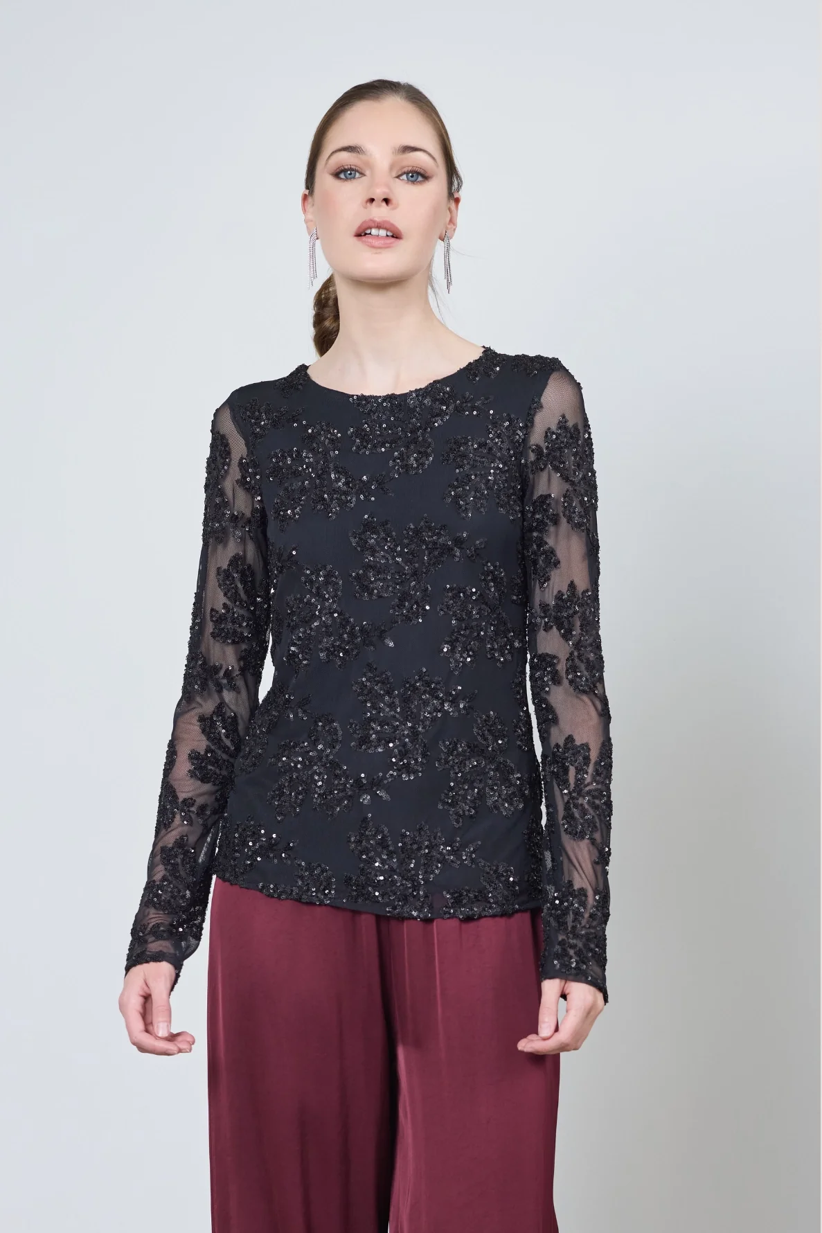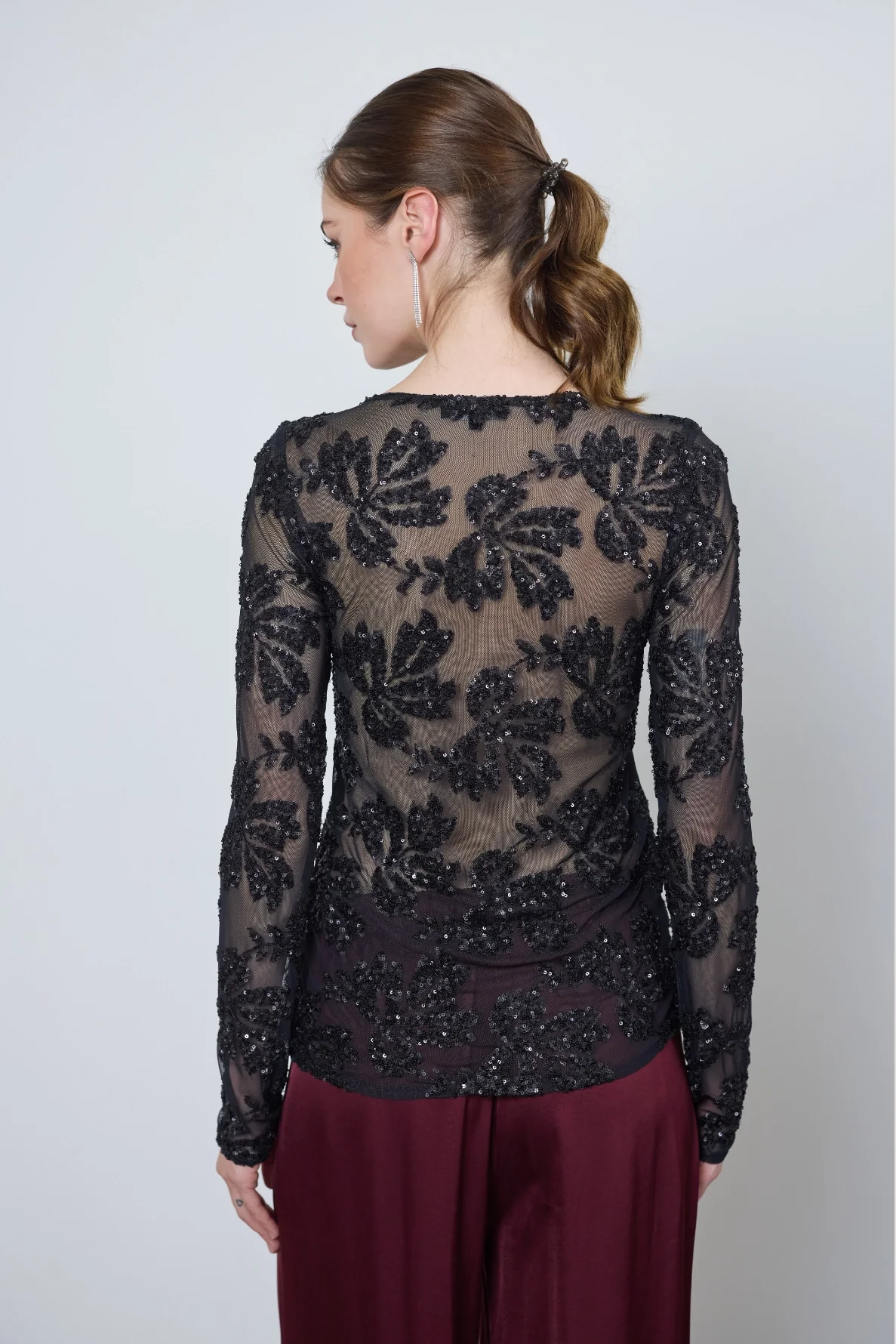 Le t-shirt Sacha, brodé de sequins, allie audace et élégance. Ses touches de transparence subtiles sur les bras et le dos créent un look festif parfait pour les soirées.