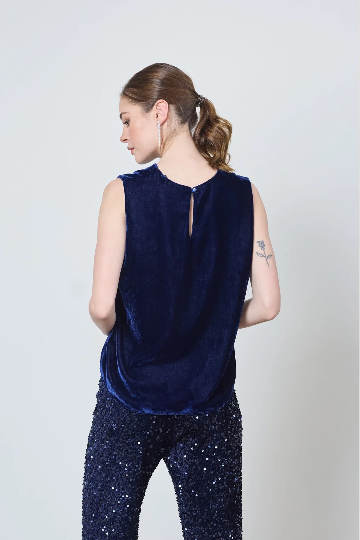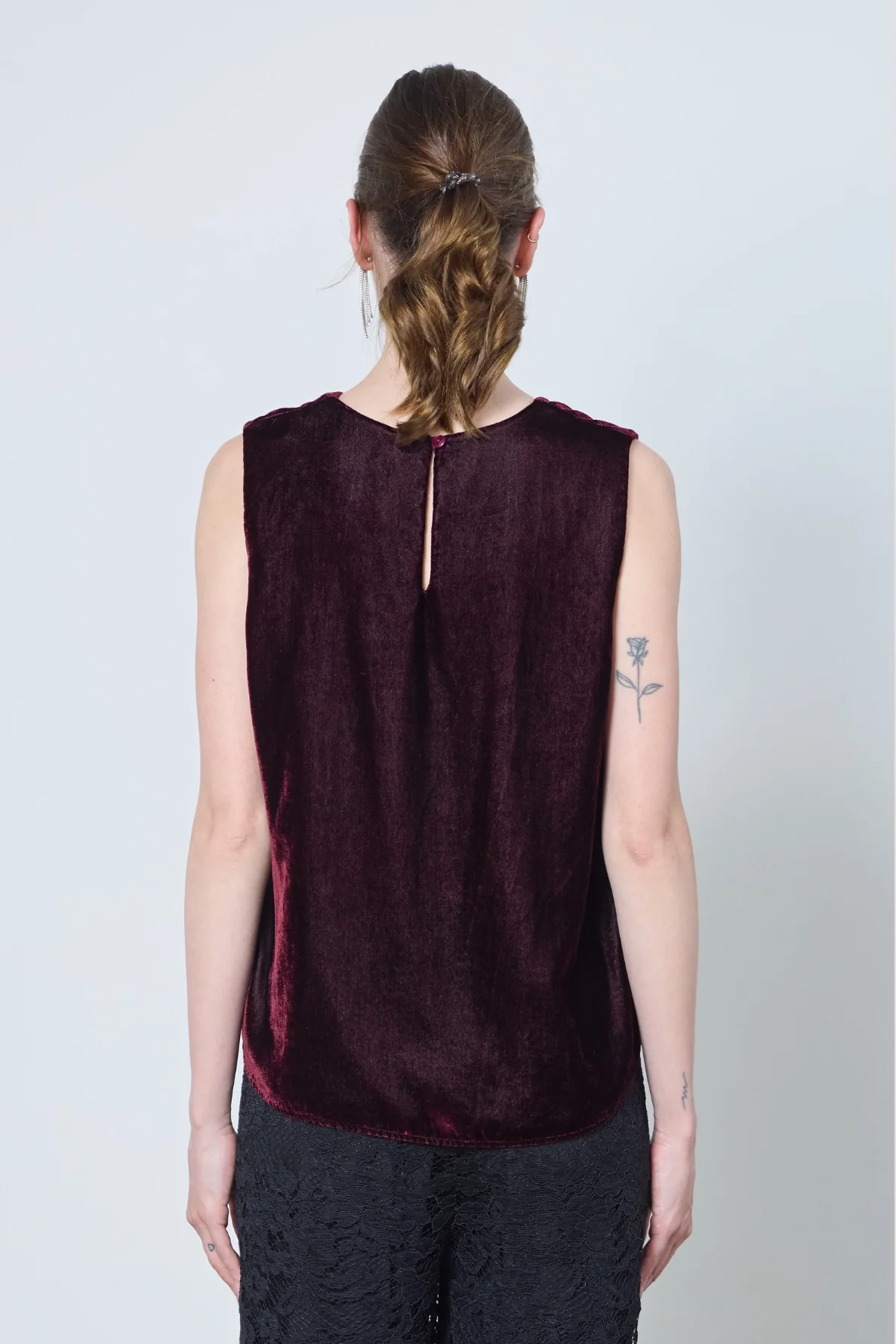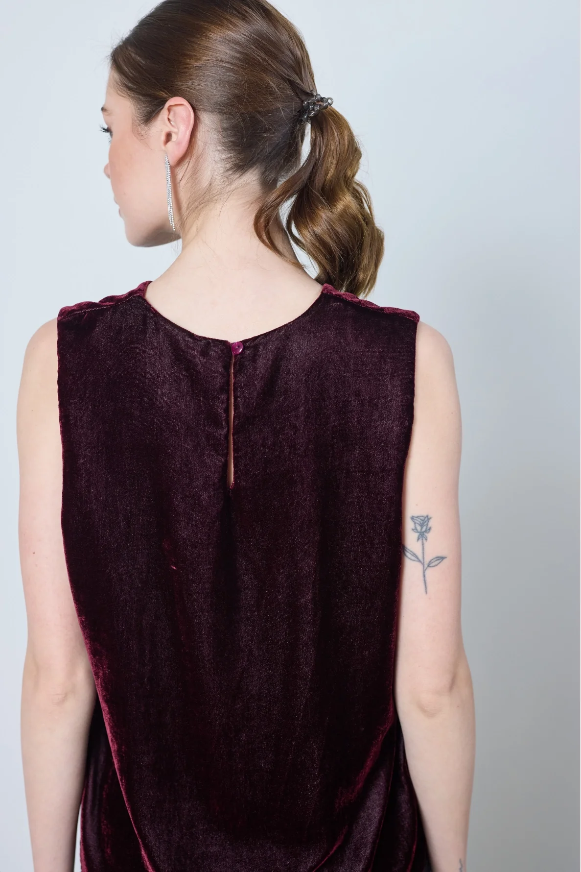 Le top Marie, débardeur en velours lisse, allie élégance et minimalisme. Son dos boutonné et sa coupe épurée apportent raffinement et confort à vos tenues.
