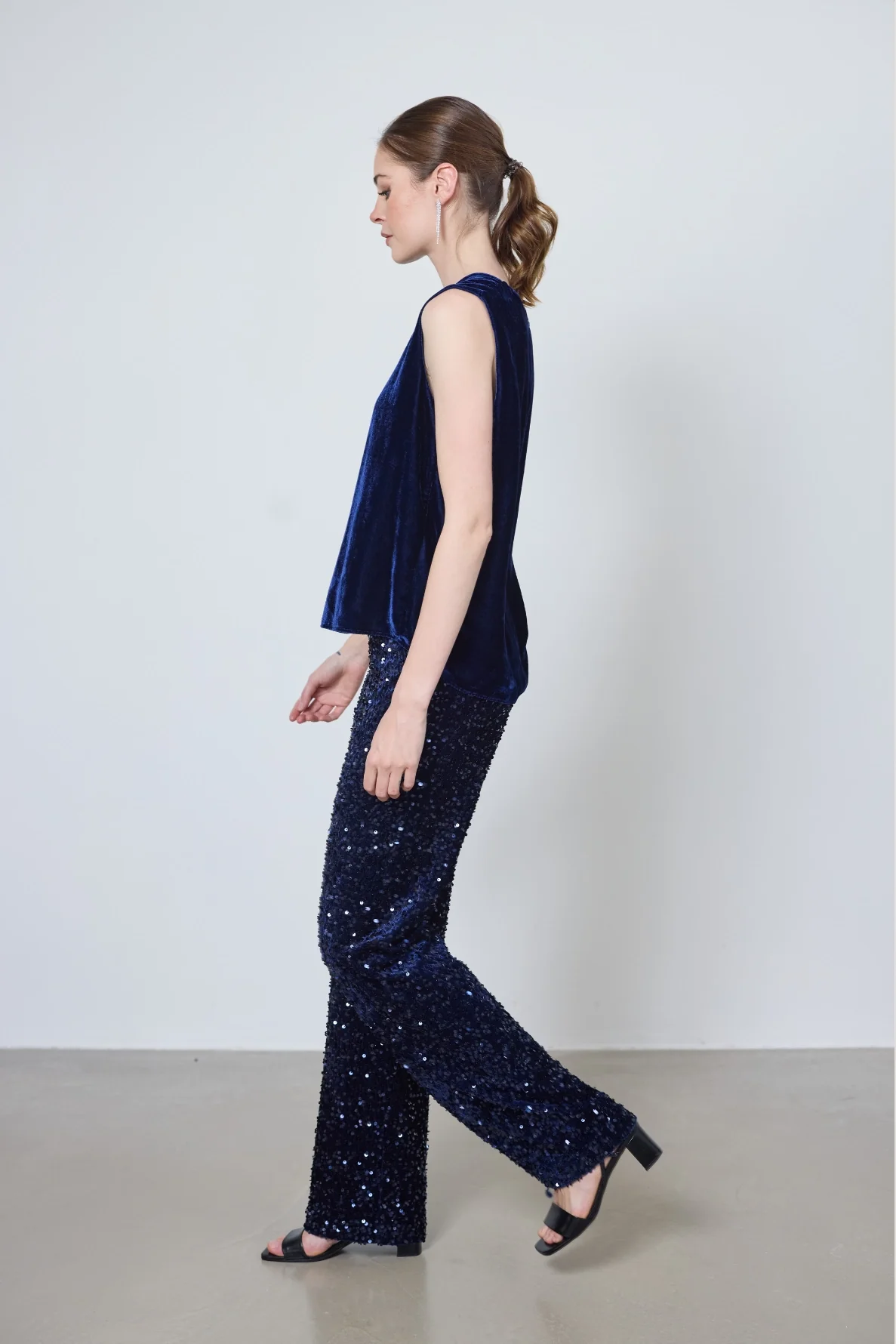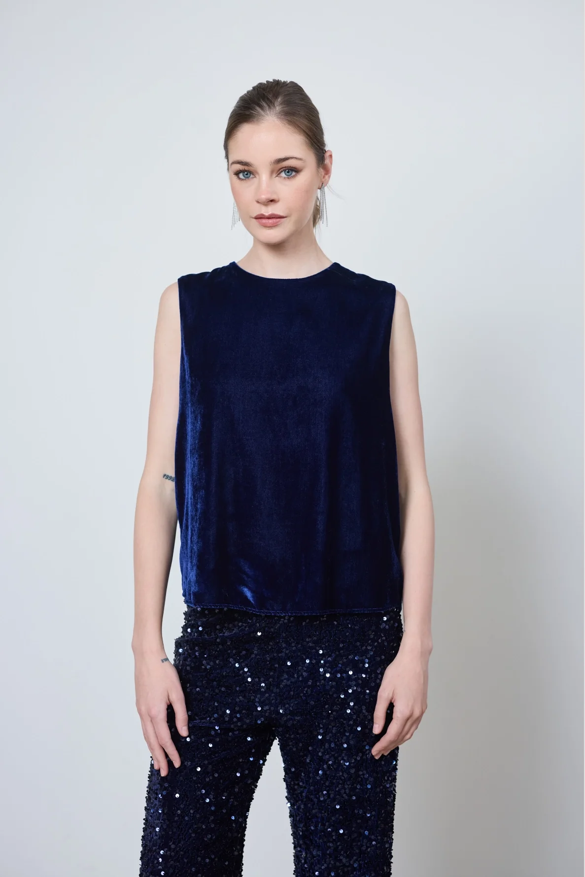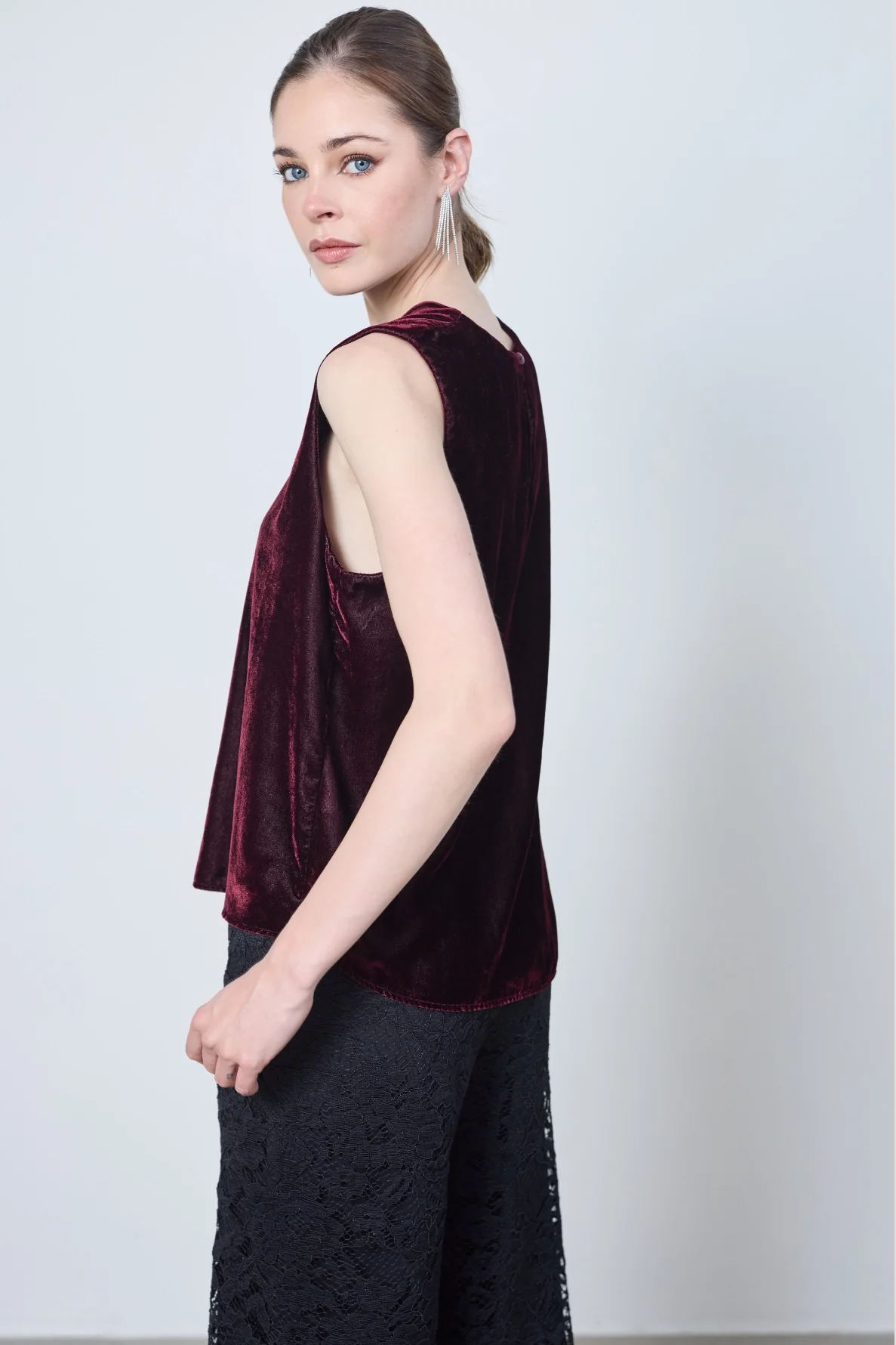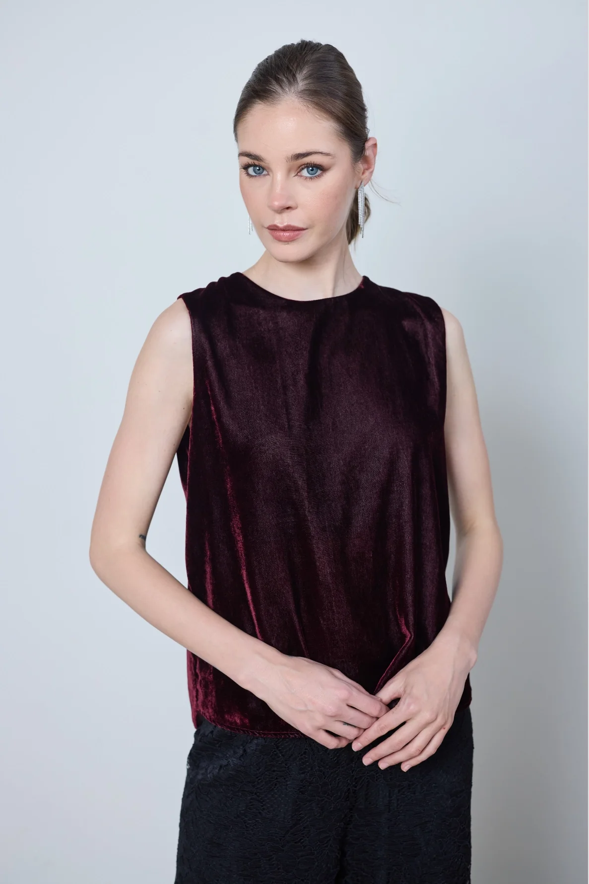 Le top Marie, débardeur en velours lisse, allie élégance et minimalisme. Son dos boutonné et sa coupe épurée apportent raffinement et confort à vos tenues.