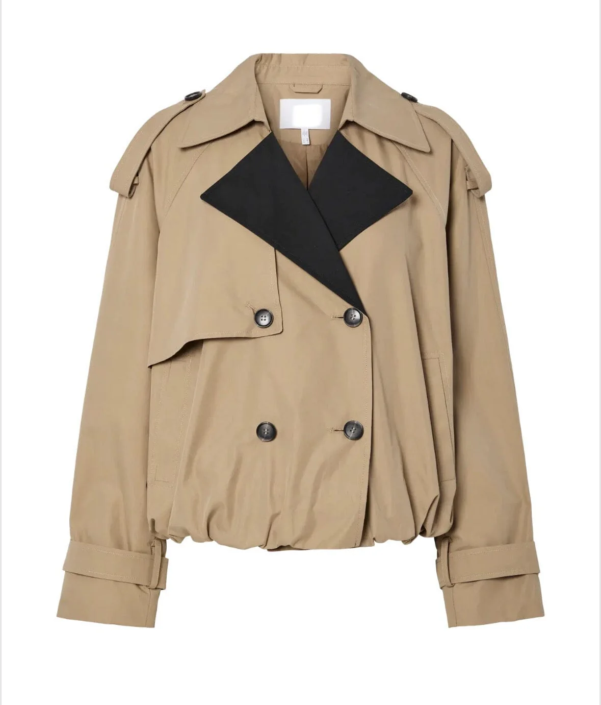 Trench court. Bouffant dans le bas. Fermeture boutonnée. Poignets boutonnés.