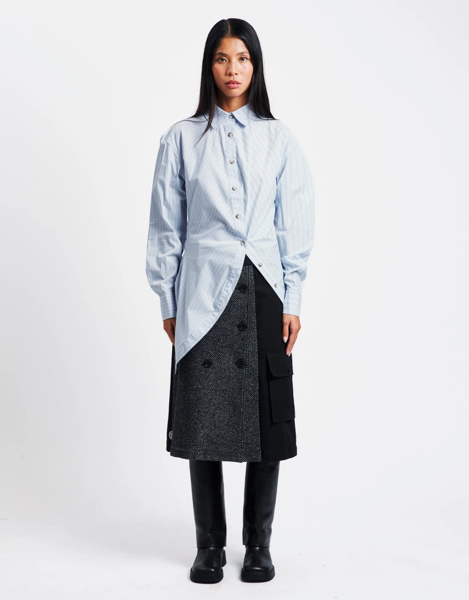 Andersson Bell Twist Check Shirt fremviser en unik blanding af moderne stil og klassisk design. Fremstillet i 100% bomuld kombinerer denne skjorte et western-inspireret ternmønster med frynsete denimlapper for et råt, men sofistikeret udtryk. Dens omhyggelige konstruktion sikrer både komfort og holdbarhed, hvilket gør den til et alsidigt supplement til enhver garderobe. Perfekt til at løfte afslappede looks eller tilføje et statement-stykke til dit outfit, udstråler Twist Check Shirt den ubesværede, chic æstetik, som Andersson Bell er kendt for.