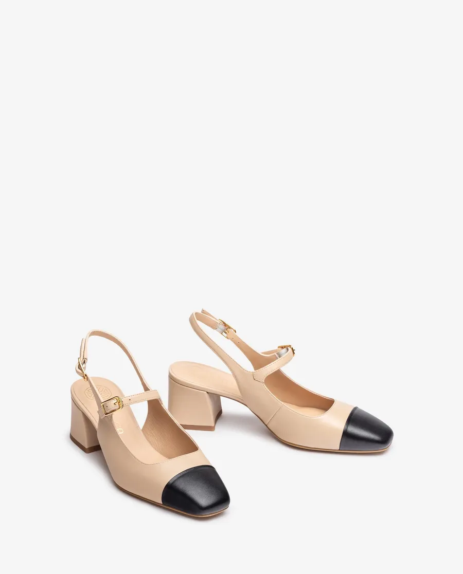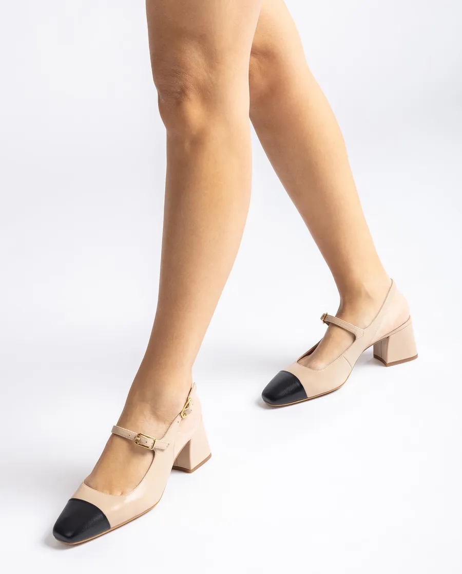 Ballerines avec bride à bout carré en cuir. Pointe en cuir noir contrastée Brides réglables avec boucle en métal sur le cou-de-pied et la cheville. Talon de 5,5cm de haut doublé en cuir. Semelle en caoutchouc léger, souple et antidérapant. Un modèle parfait au quotidien.