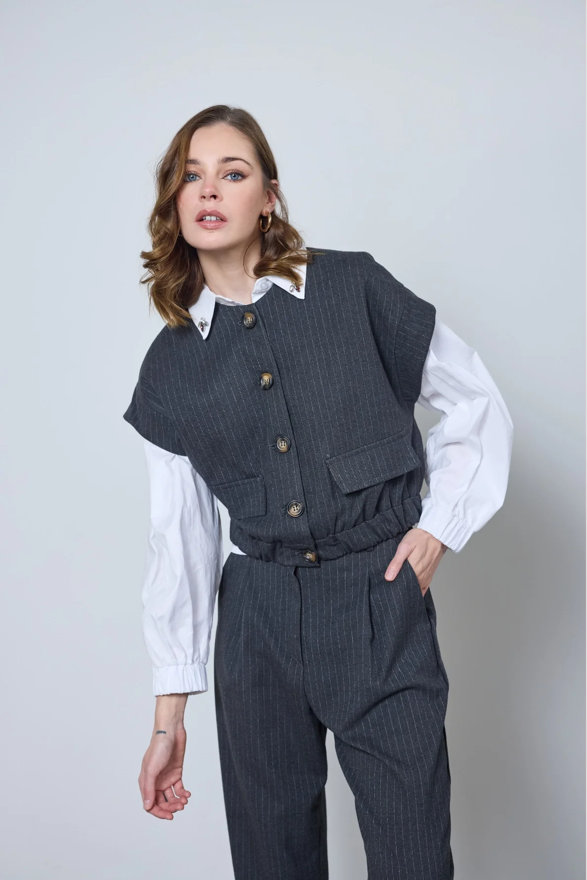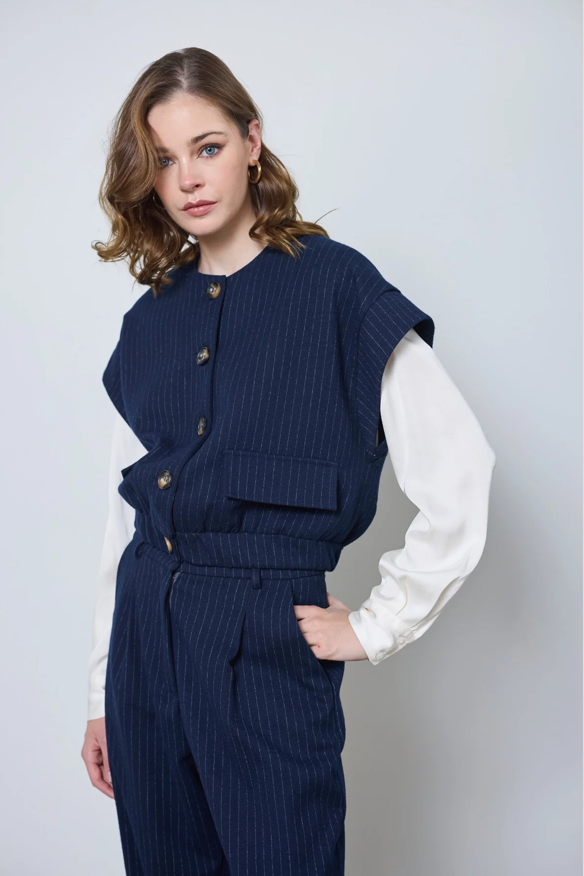 La veste Anaëlle apporte confort et style à vos tenues. Sans manches et avec un élastique à la taille, elle crée une silhouette moderne et décontractée.