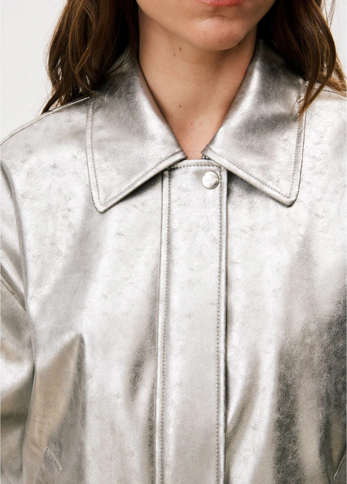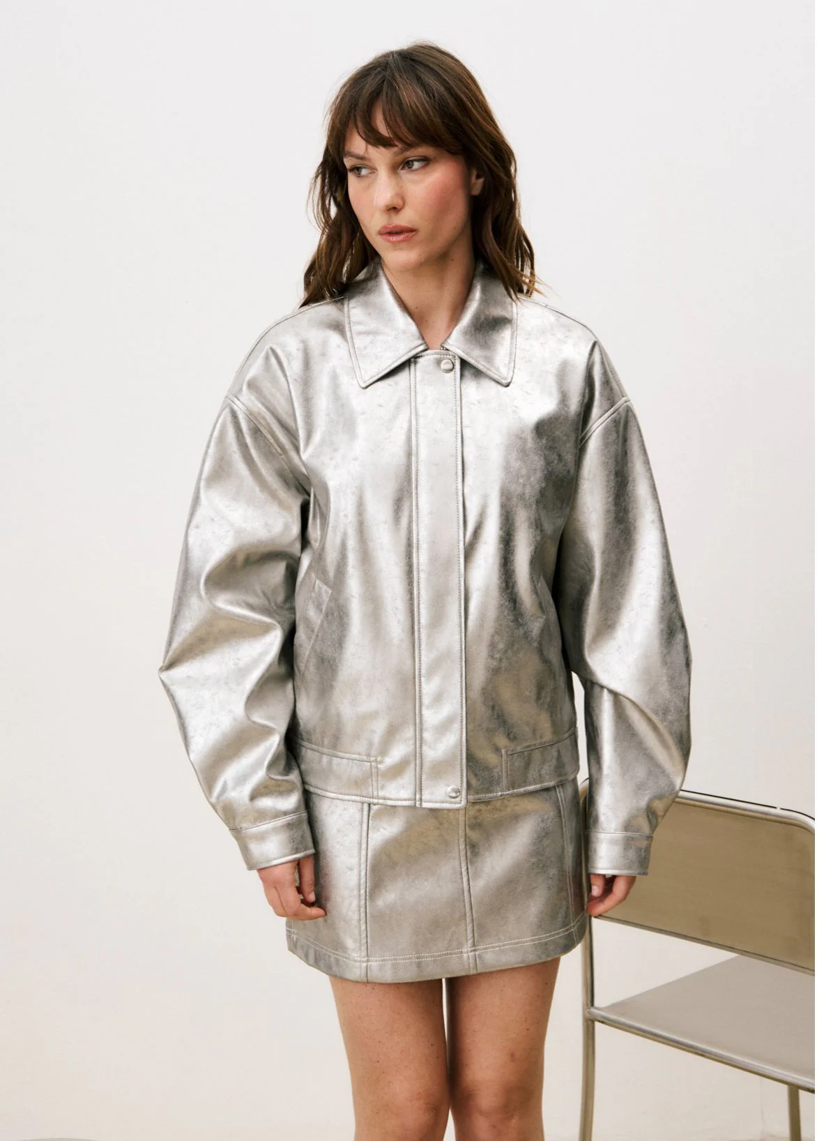 Matière effet cuir métallisé argenté. Fermeture à boutons pression dissimulée. Poches latérales. Doublure intérieure ton sur ton.