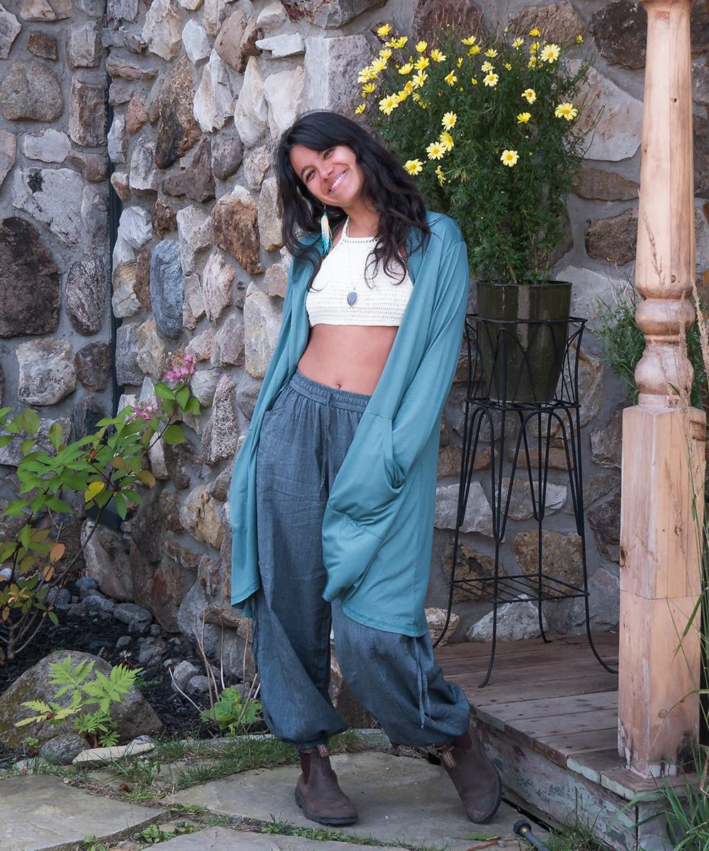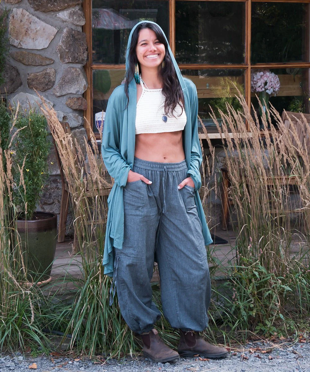 Cette veste de bambou avec capuchon et de grandes poches, offre un mélange parfait de confort, d’élégance et de praticité pour un look décontracté et boho.