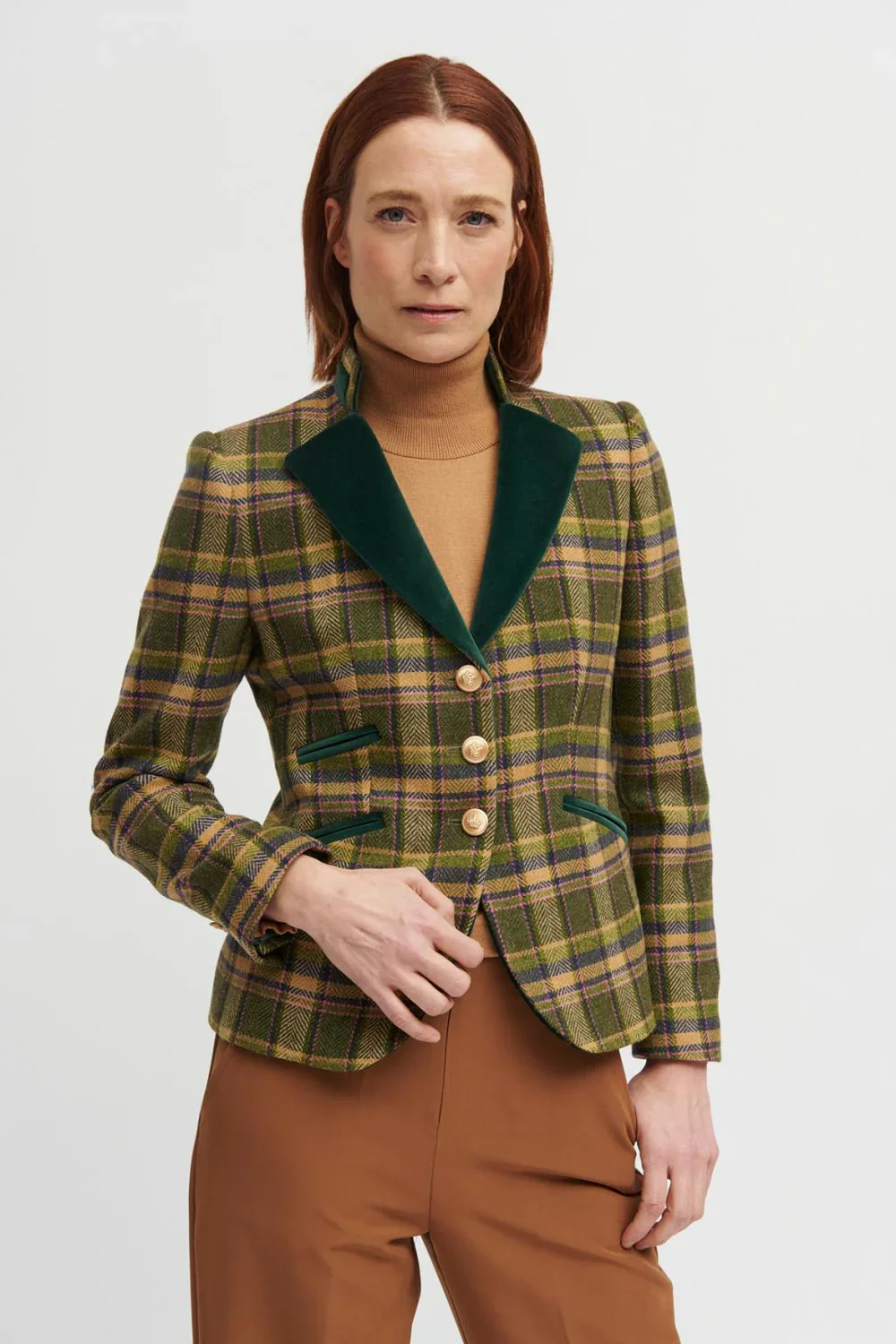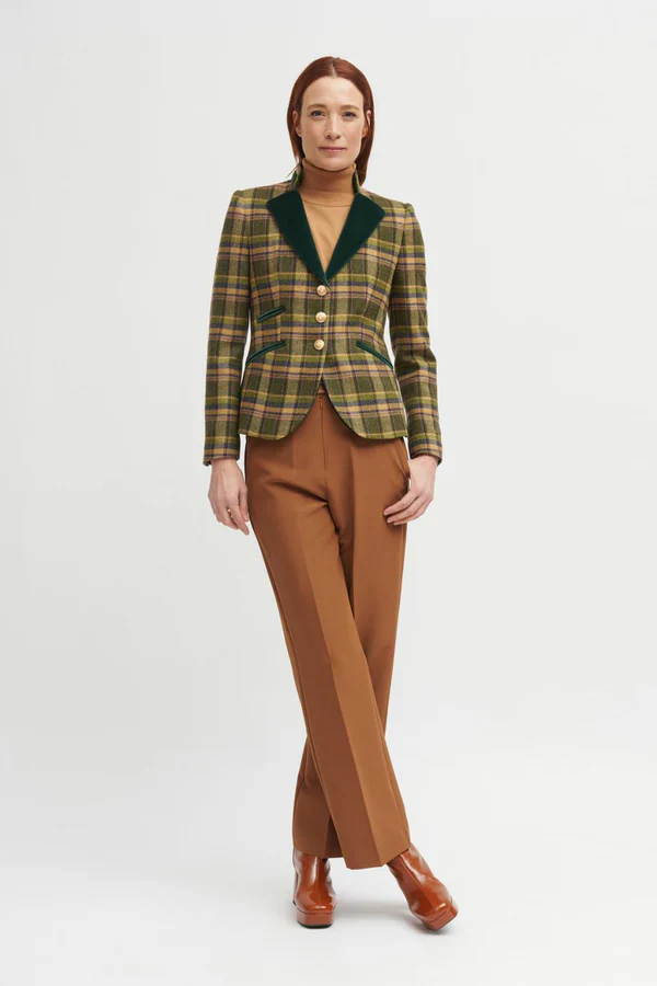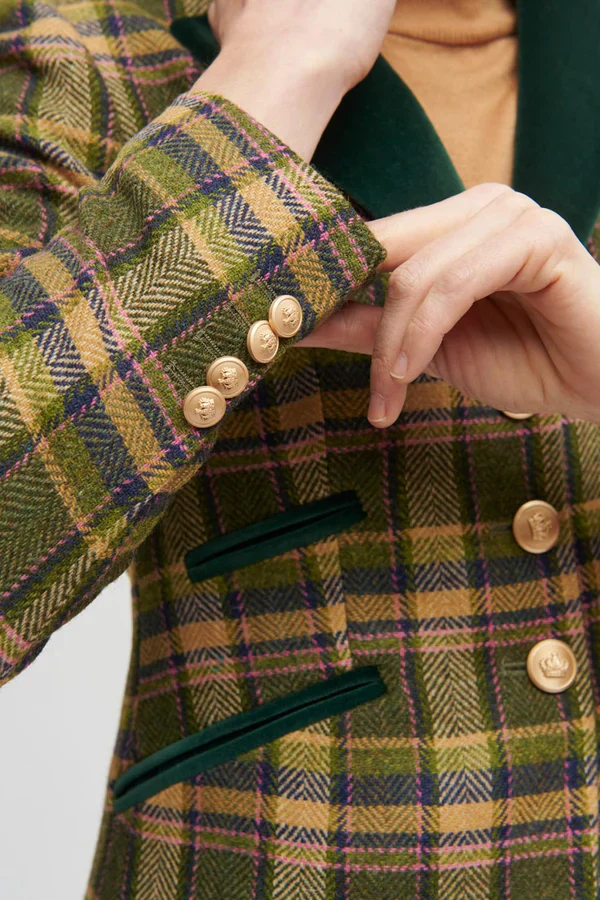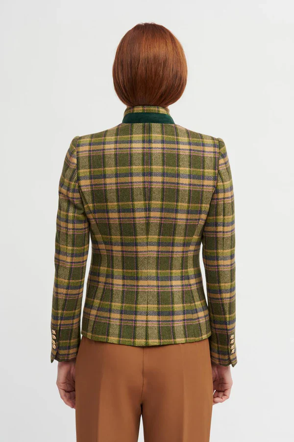 Veste américaine en tissu tweed à carreaux. Col à revers en pointe avec détail en velours uni. Fermeture frontale avec trois boutons métalliques en relief. Manches longues avec fausse fermeture boutonnée et légère ouverture. Fausse poche passepoilée en velours. Ourlet arrondi sans ouvertures. Doublure intérieure contrastée.