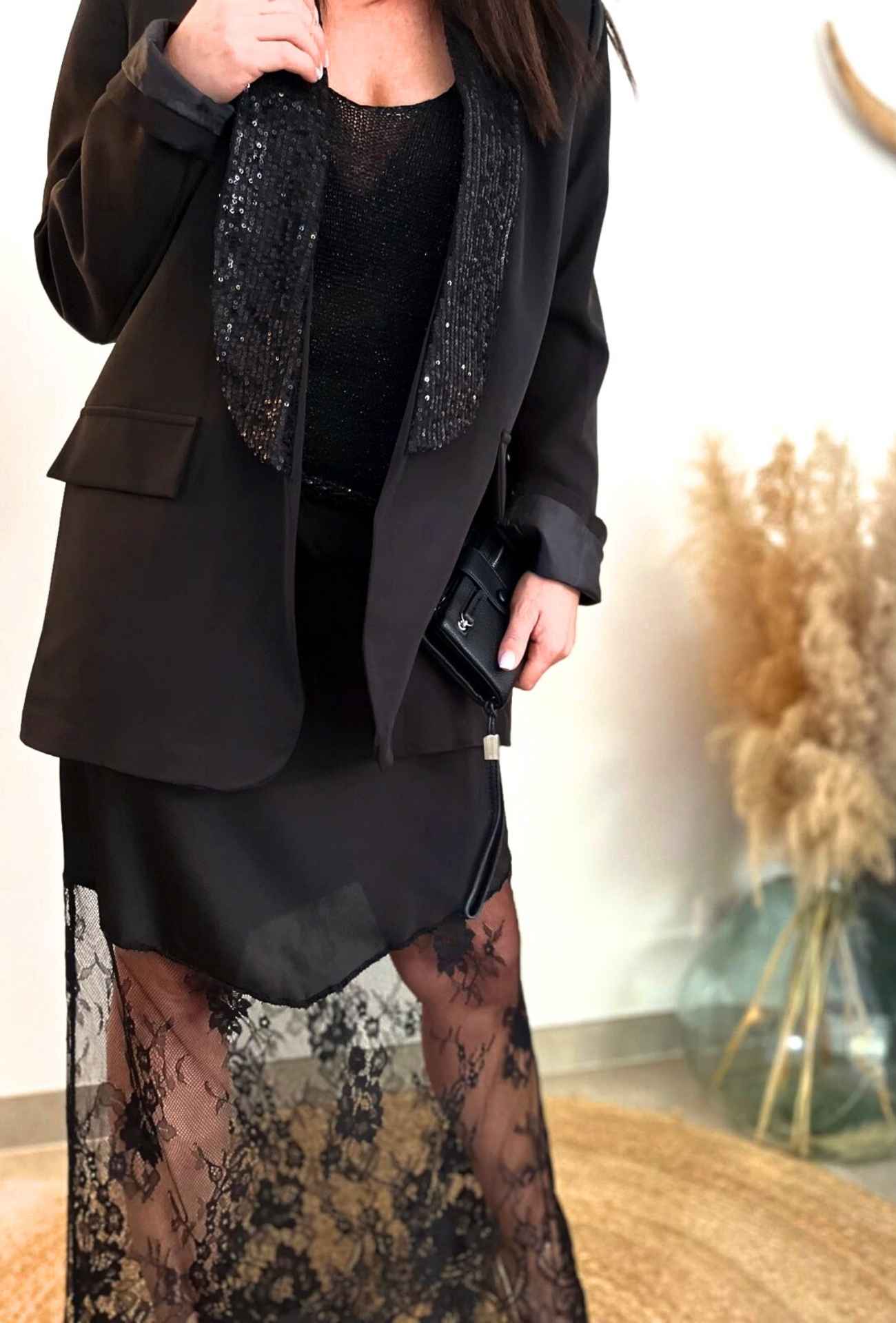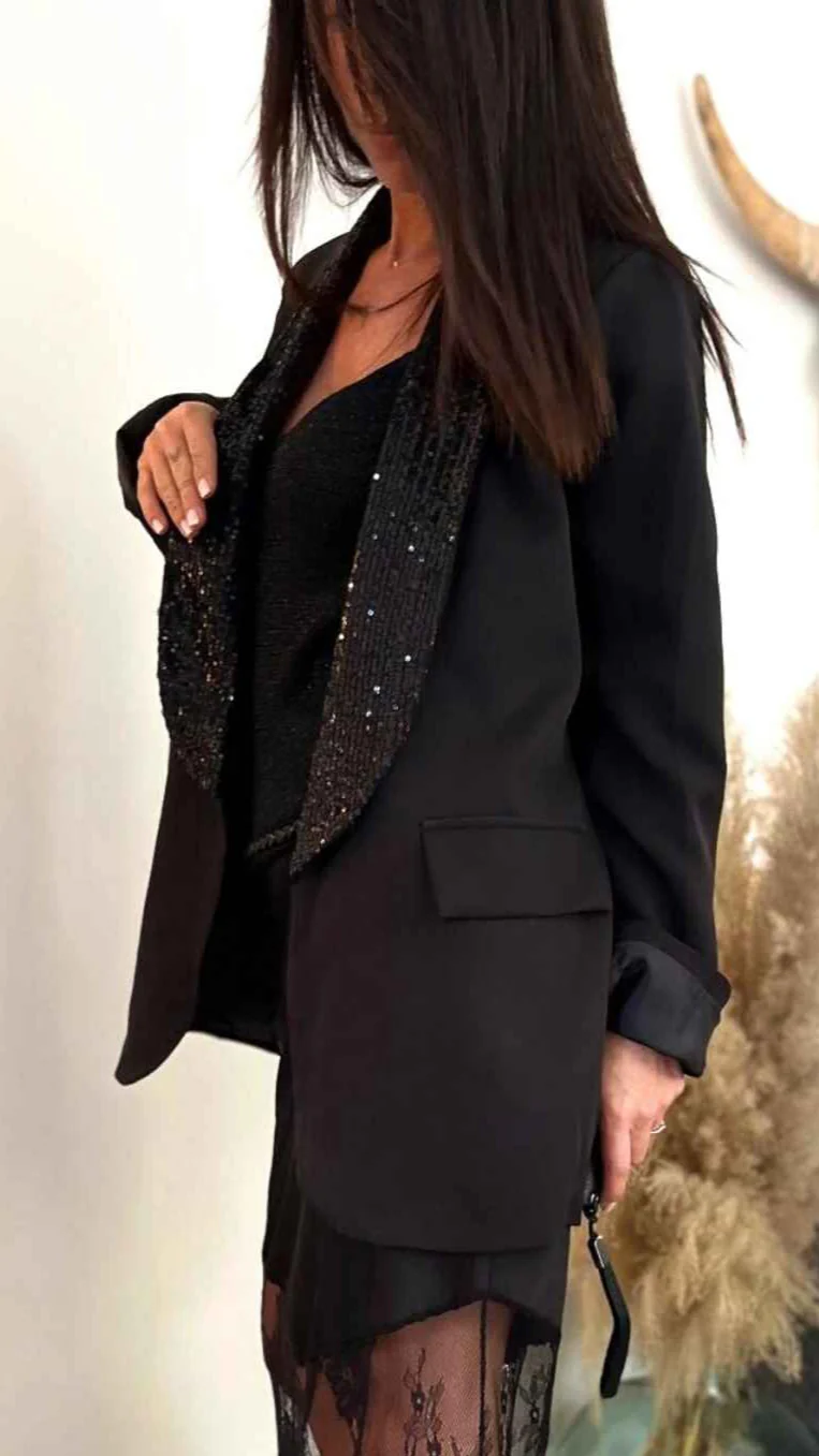 Laissez-vous séduire par l’élégance intemporelle de la veste blazer LINDA en noir. Confectionnée dans une matière fluide, cette pièce est sublimée par un col orné de sequins qui ajoute une touche de glamour irrésistible. Sa coupe structurée et ses détails sophistiqués en font un incontournable pour des looks chics et modernes, aussi bien pour vos soirées que vos rendez-vous professionnels.