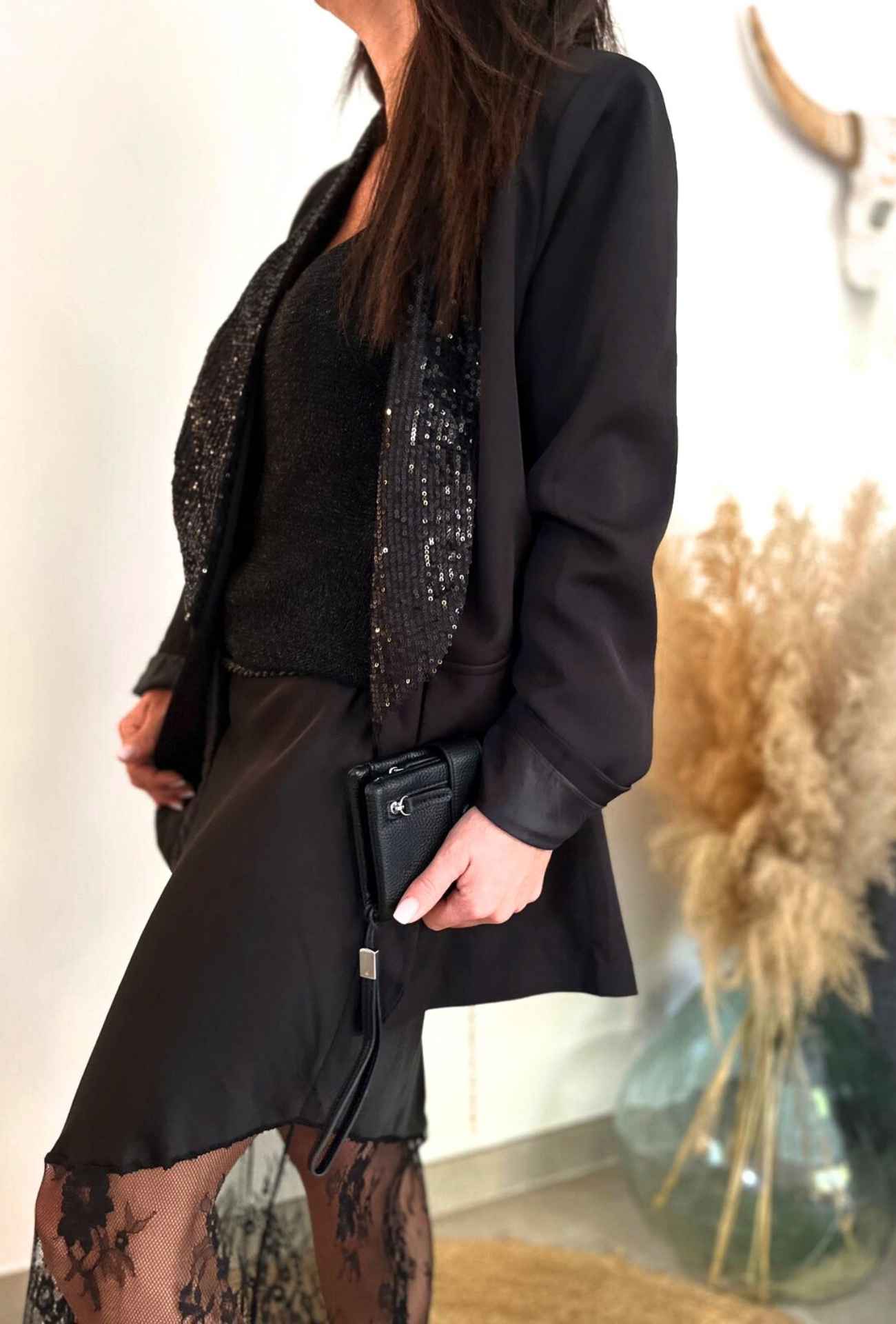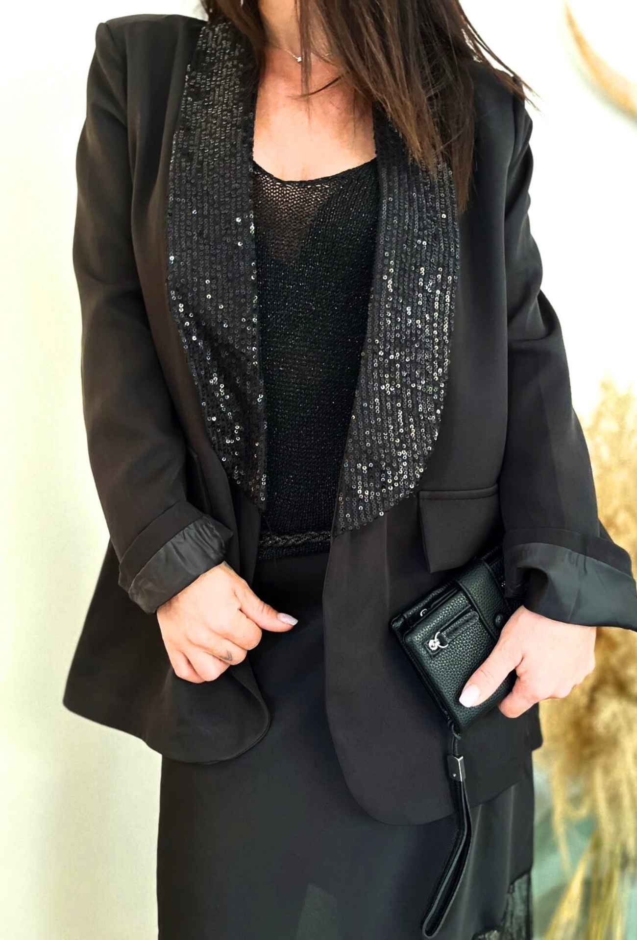 La veste LINDA est la pièce parfaite pour élever instantanément vos tenues. Son col en sequins capte la lumière et attire tous les regards, tandis que sa coupe fluide et flatteuse s’adapte à toutes les morphologies. Idéale pour un look chic sans effort, elle s’accorde aussi bien à des robes sophistiquées qu’à des ensembles plus décontractés.