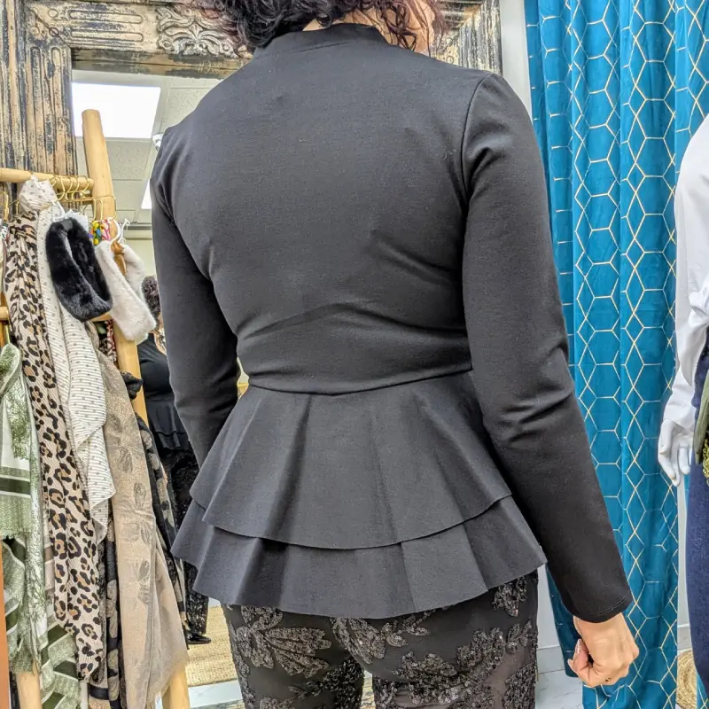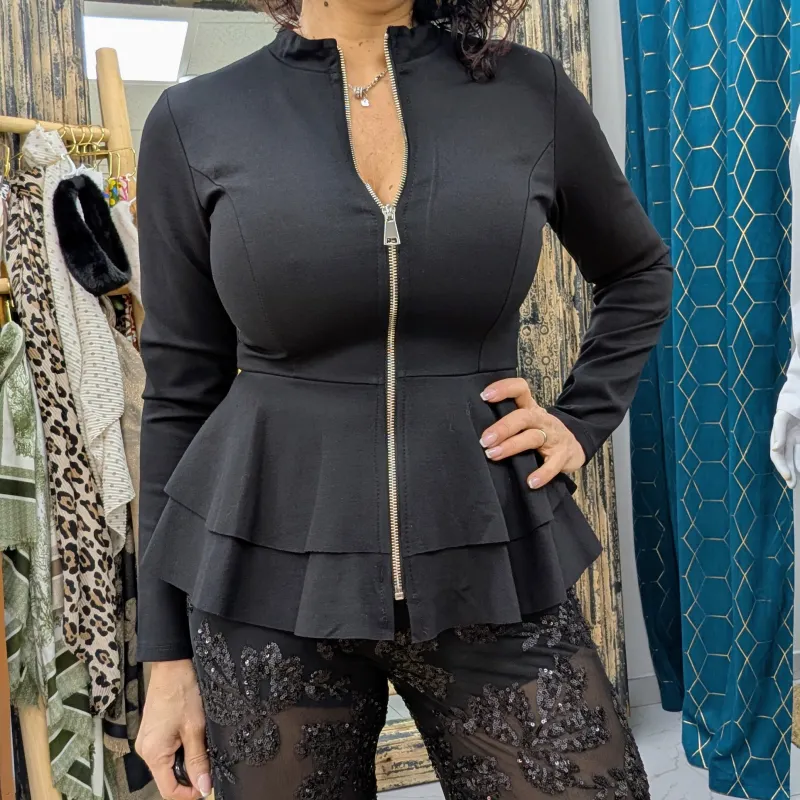 Cette veste se distingue par sa coupe unique qui épouse parfaitement les courbes du corps au niveau du buste, tandis qu’elle s’évase délicatement à la taille grâce à son double volant. Ce détail ajoute une touche de féminité et de mouvement, rendant la veste non seulement élégante, mais aussi dynamique. Le zip sur le devant permet une fermeture facile et pratique, tout en apportant une note contemporaine à l’ensemble.