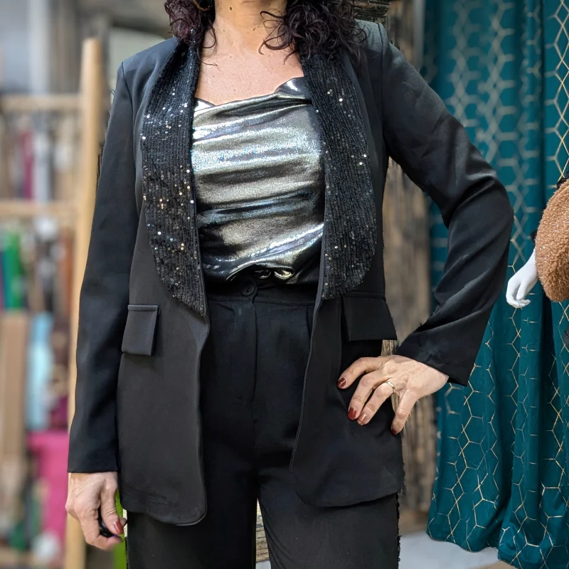 Veste Noire Élégante avec Col Châle en Sequins
