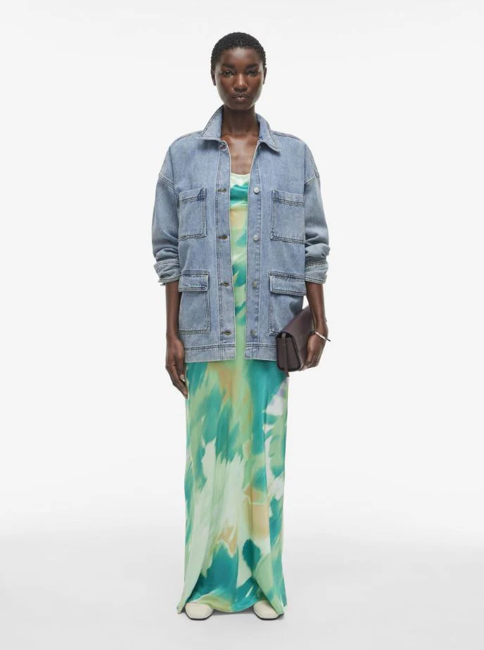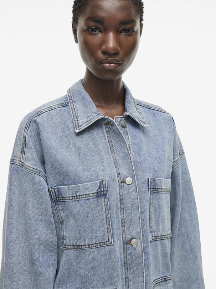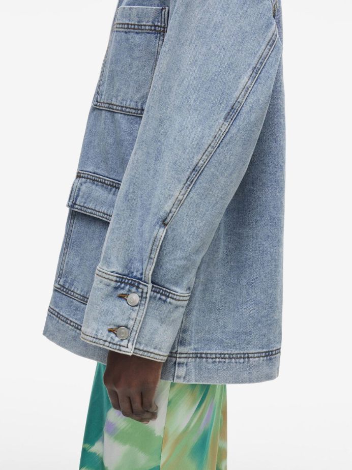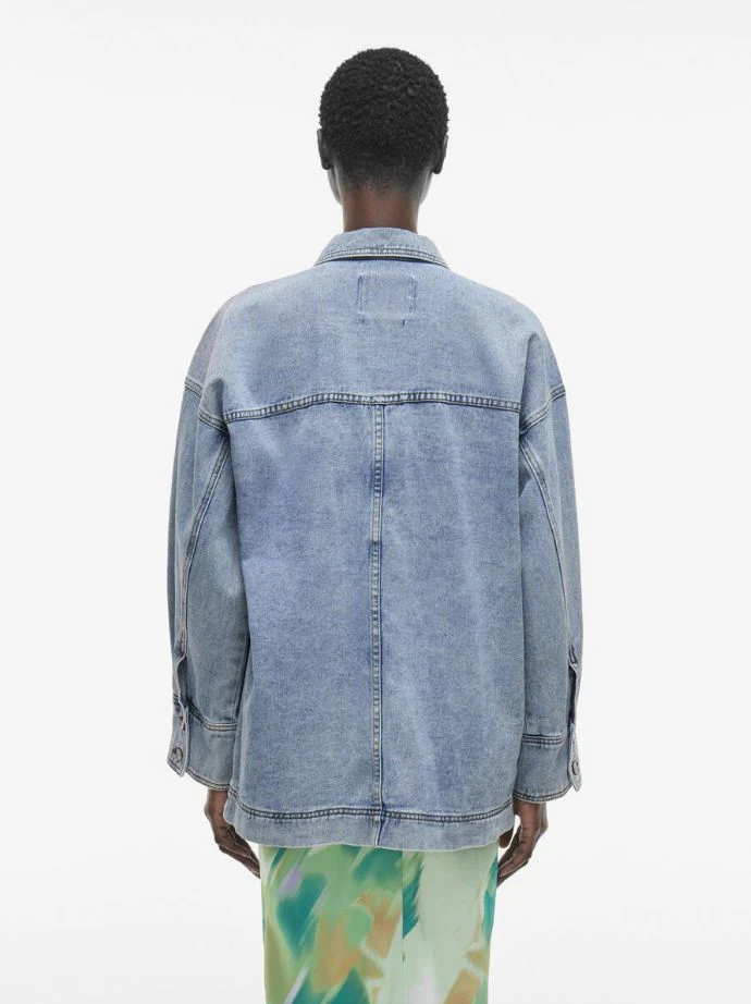 Veste en jean à manches longues. Boutonnée sur le devant. Épaules tombantes. Poches avant. Poignets à deux boutons. Coupe ample.