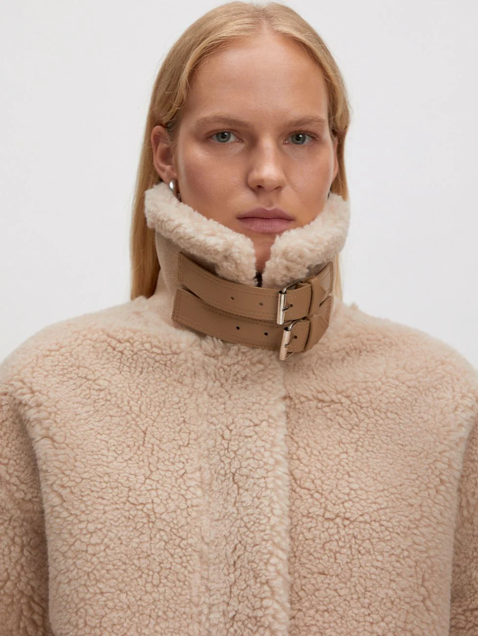 Doudoune moumoute. Sangle au niveau du cou. Manches resserrées aux poignets. Matières: 65% Polyester, 35% Laine. Doublure: 100% Polyester. Clara mesure 1m74 et porte une taille S.