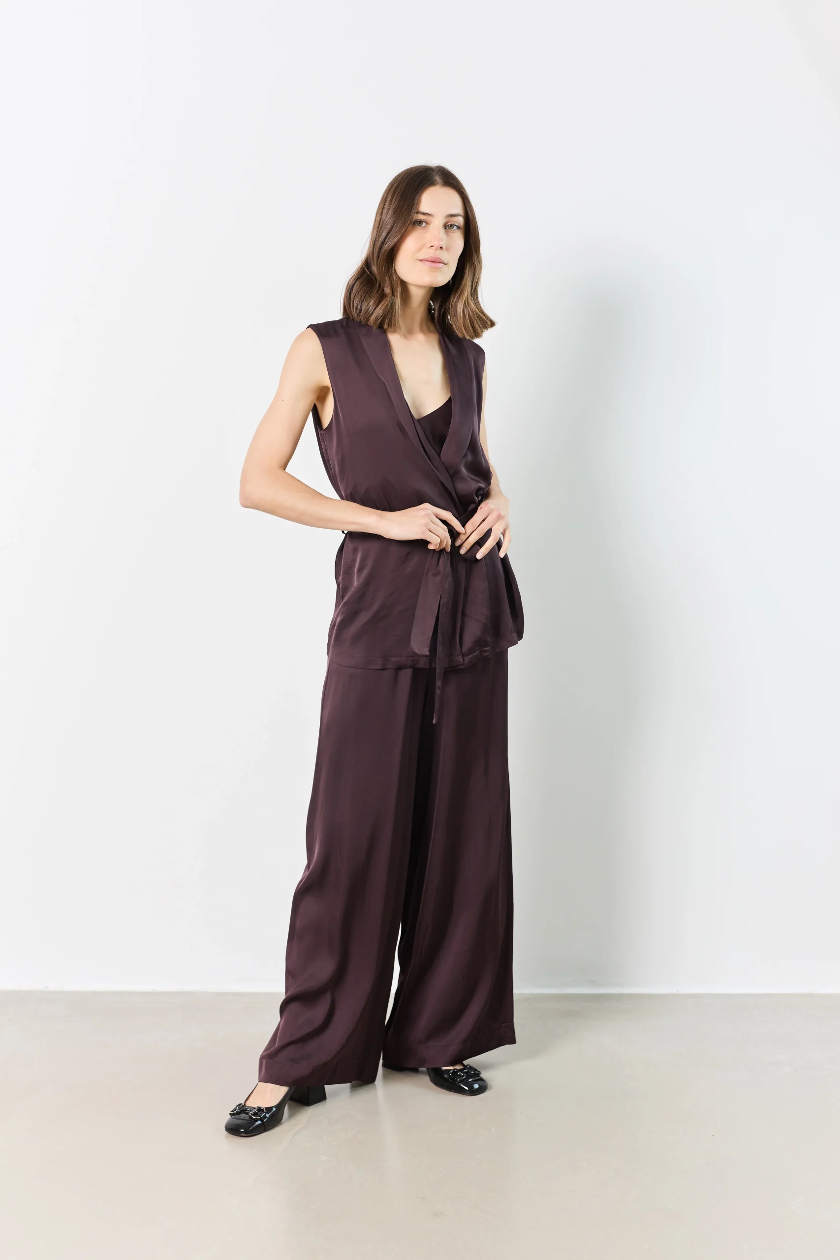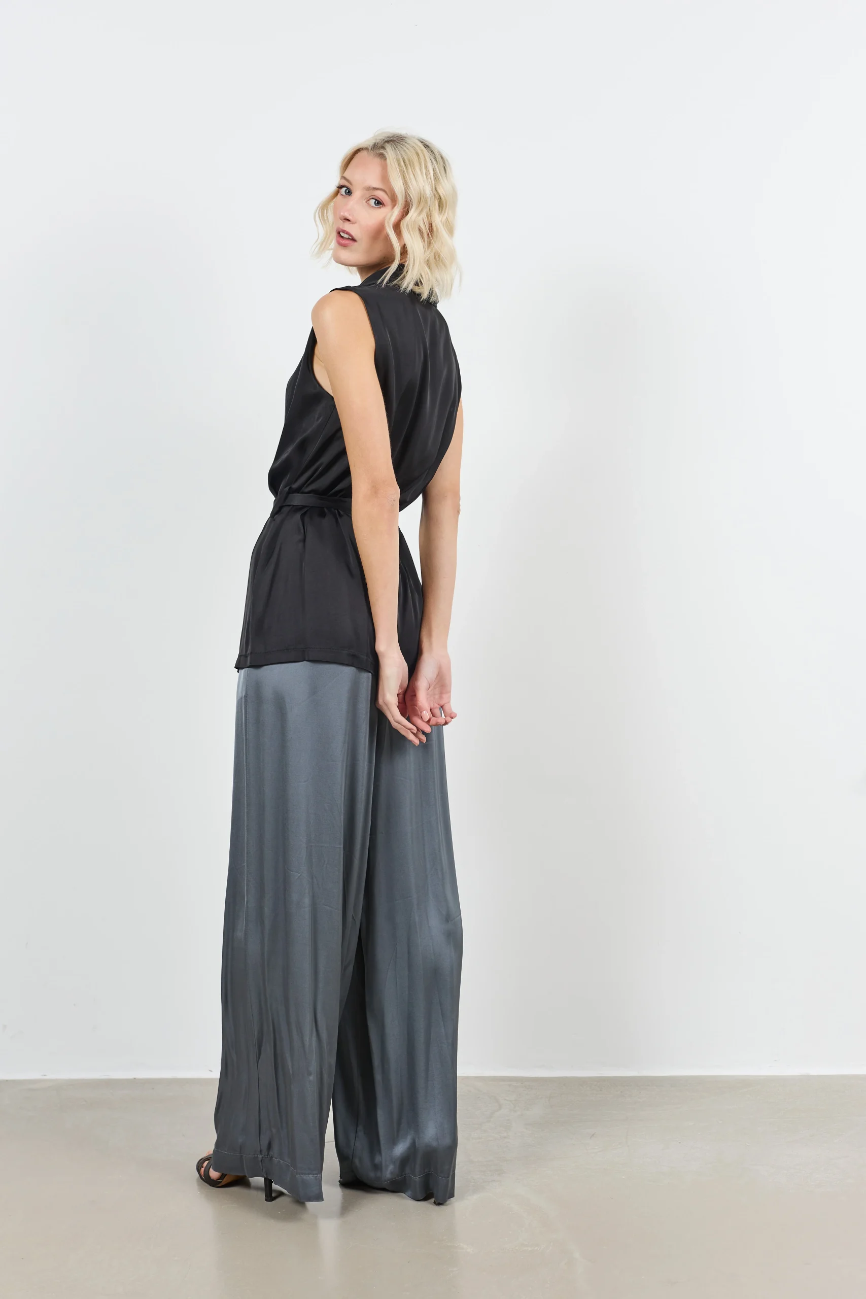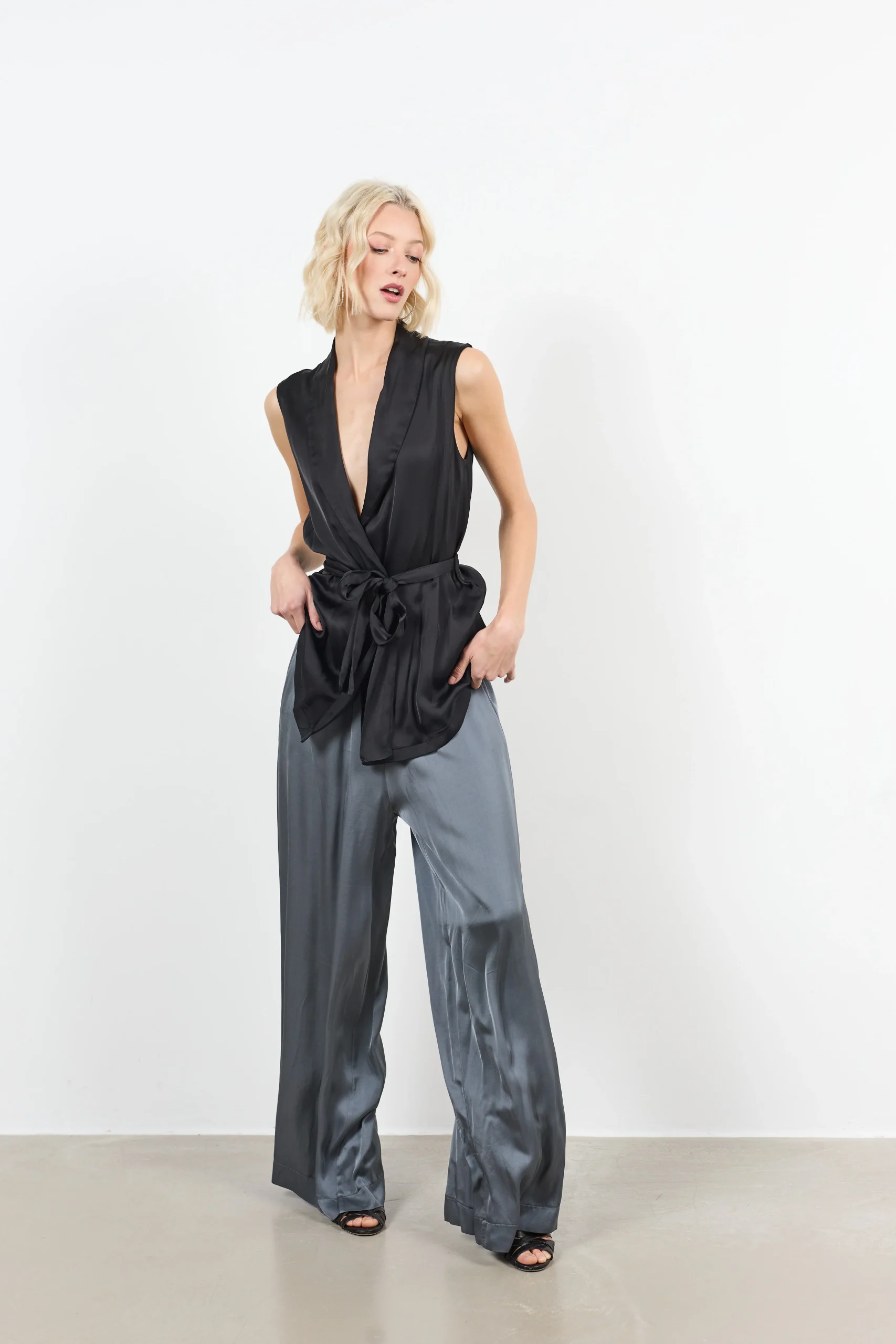 Veste sans manches en satin noir, avec col drapé et ceinture à nouer. Fluide et élégante, elle apporte sophistication et style à vos tenues habillées.