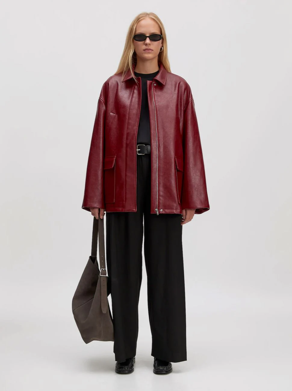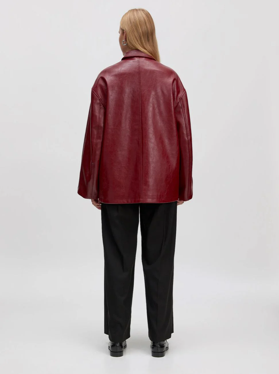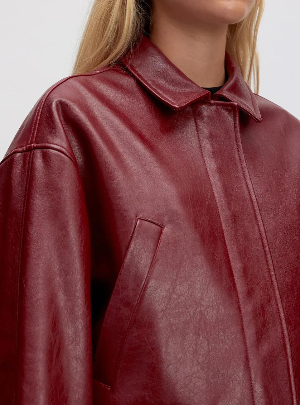 Veste simili bordeaux. Coupe droite. 4 poches. Fermeture à zip. Matières: 100% Polyuréthane (recyclé).Doublure: 100% Polyester. Clara mesure 1m74 et porte une taille S.
